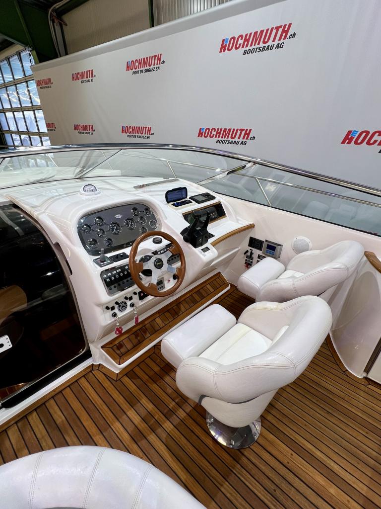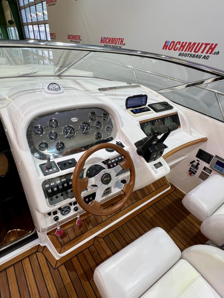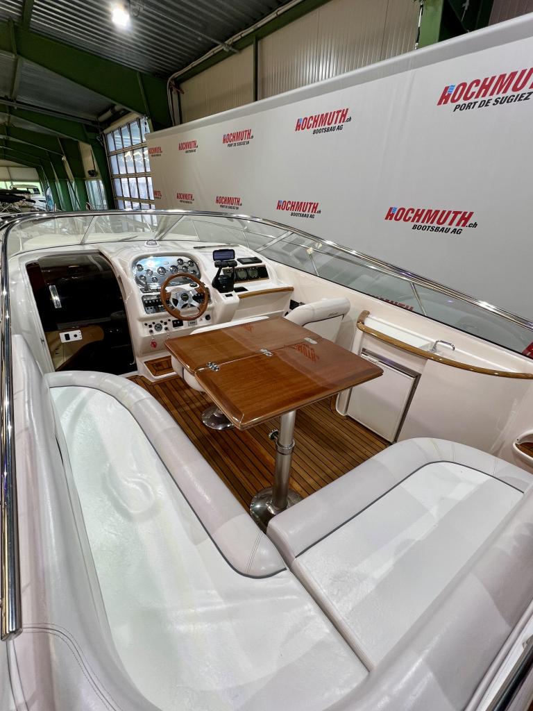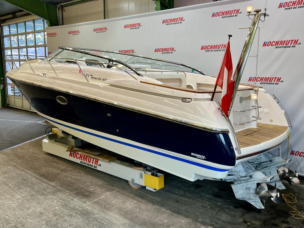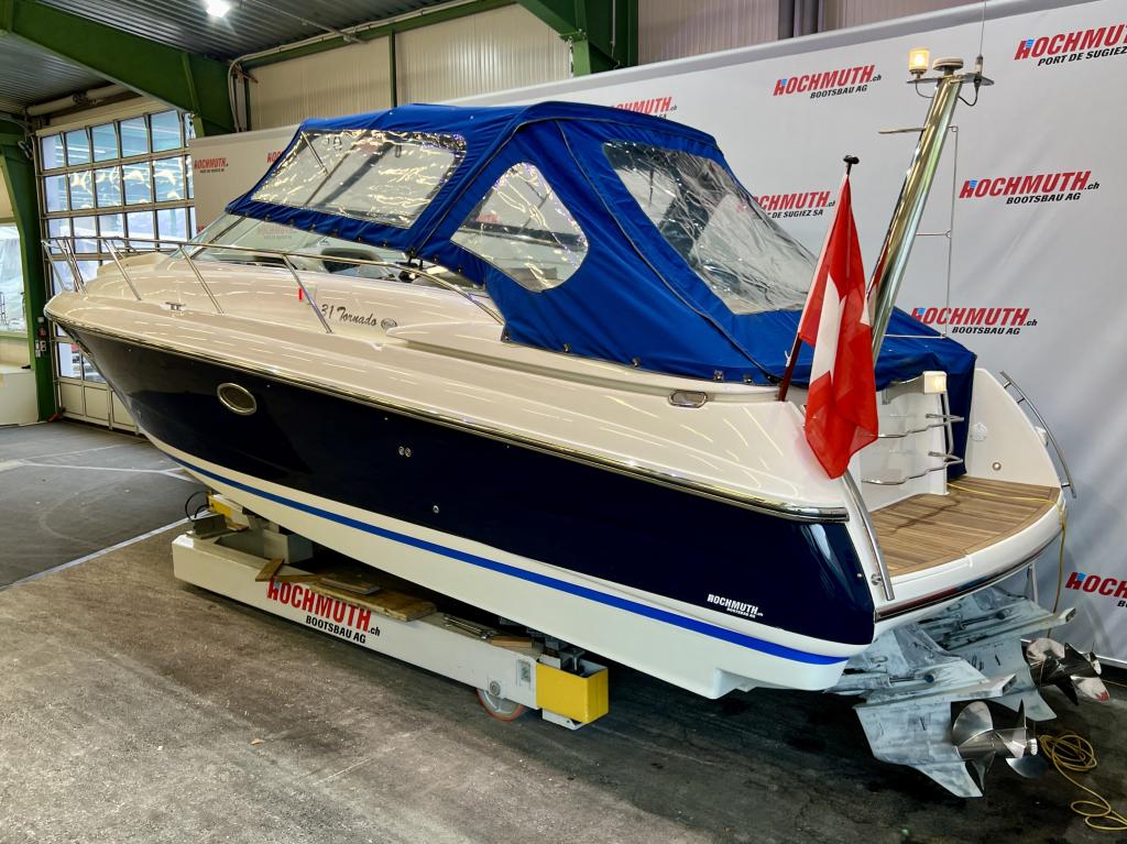 The Windy 31 Tornado is arguably the most beautiful combination of sports boat and cruiser. It impresses with a spacious cockpit that features a sun lounger at the stern, a fold-out table and swivel seats. The cabin with separate wet room offers sleeping space for up to four people. And all this in the typical Windy design DNA with its sporty, elegant lines. We look forward to welcoming you to our large showroom soon and showing you the Windy 31 Tornado in person. Position light Instrument lighting Bow light Cabin lighting Cockpit lighting Swimming platform lighting Windscreen wipers Cooker Radio/CD Charger 230V sockets Hour meter Water tank gauge Holding tank system with suction via deck Holding tank gauge Compass Full tarpaulin Canopy Toilet Stern shower Electric windlass 2 refrigerators (cabin and cockpit) Teak cockpit Teak bathing platform Very spacious seating area Underwater paint 220V shore power connection Boiler Bow mat Bow thruster Anchor light Chrome steel mast Boat equipment From service From MFK Boat (1054) - Total incl. 8.1% VAT = CHF 82'000.00 Ask about our unique moorings in sunny Ticino. Enjoy the Mediterranean climate and relaxed atmosphere while mooring your boat safely and comfortably in one of the best marinas in Ticino. The perfect starting point for unforgettable ''dolce vita'' moments on Lake Maggiore. We are also happy to offer you a suitable indoor mooring on the Jura lakes with the highest possible level of comfort. Situated on the Broje Canal, between Lakes Neuchâtel and Murten, this is the ideal starting point for exploring Switzerland's largest water sports area. Further details about this unique facility in Switzerland can also be found on our website. For further information on our moorings, please do not hesitate to contact us by telephone.