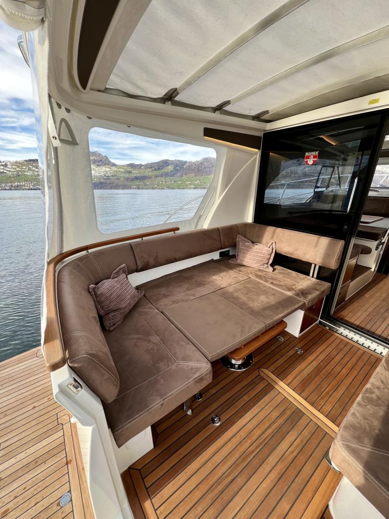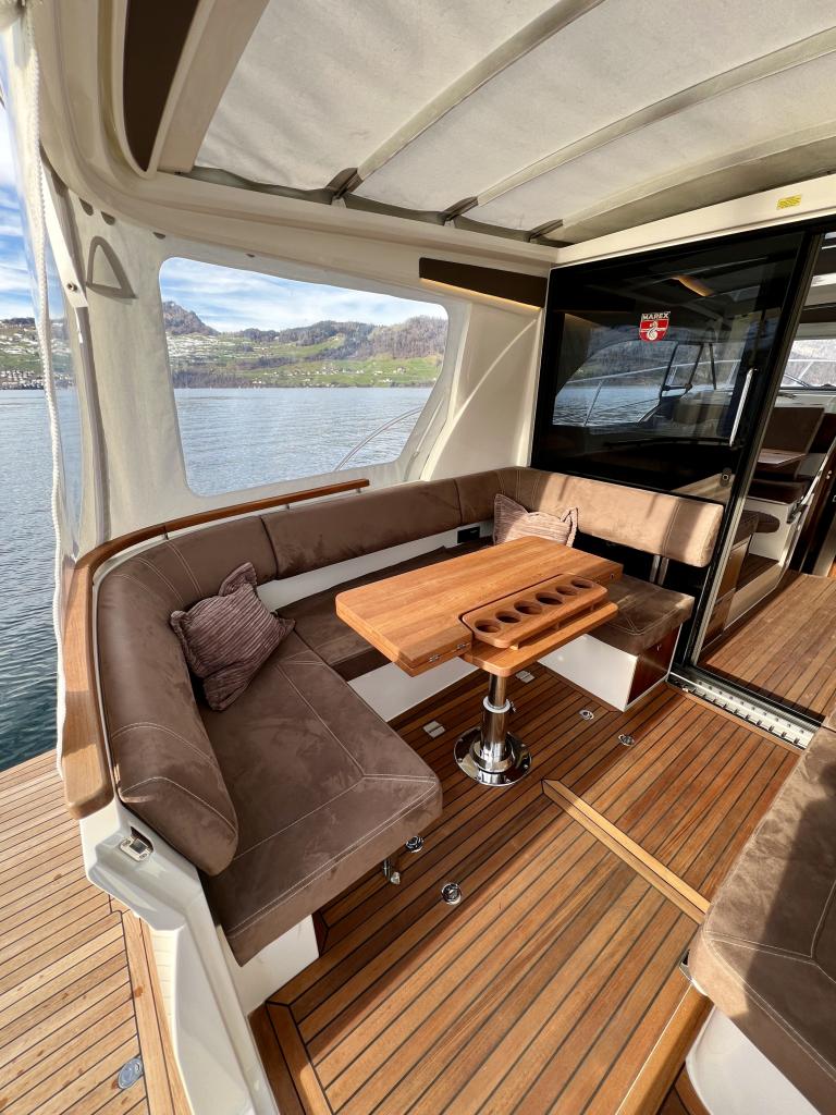 Boat incl. standard equipment Accessories: Anchor chrome steel chain (50 m) Electric bow anchor winch with remote control Chain counter Bar stools Additional battery DAB Fusion radio Reversing camera LED interior lighting Dimmer for LED lights Swiss standard sockets Window protection cover Fenders with covers and Marex logo (6 pcs.) and lashing ropes Foldable radar mast 35L refrigeration unit Gas oven High-pressure deck wash pump from fresh water tank or seawater Combi inverter 12/230V 3000W with 100A charger Mosquito net for rear door Mosquito nets for all windows Mattress covers Spotlights with joystick Lounger Teak on bathing platform, sidewalks, deck, and details Underwater lighting at stern Window that opens on port side Zipwake dynamic trim control system Extended bathing platform Simrad package: NSS16 evo3S plotter with GPS, nautical chart and XSONIC transducer, NSS12 evo3S, Halo20+ radar Multi-point boat suspension Engine compartment heating Boat equipment From service From MFK Boat (1060) – Total incl. 8.1% VAT = CHF 369,000.00 Ask about our unique moorings in sunny Ticino. Enjoy the Mediterranean climate and relaxed atmosphere while mooring your boat safely and comfortably in one of the best marinas in Ticino. The perfect starting point for unforgettable ‘'dolce vita’' moments on Lake Maggiore. We are also happy to offer you a suitable indoor mooring on the Jura lakes with the highest possible level of comfort. Situated on the Broje Canal, between Lakes Neuchâtel and Murten, this is the ideal starting point for exploring Switzerland's largest water sports area. Further details about this unique facility in Switzerland can also be found on our website. For further information about our moorings, please do not hesitate to contact us by telephone.